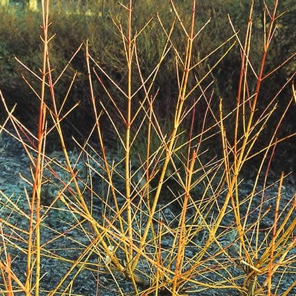 Cornus sanguinea ‘Midwinter Fire’ heeft in de winter prachtige oranje/rode takken.