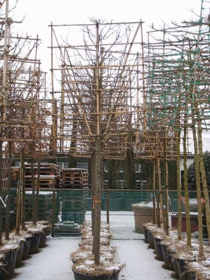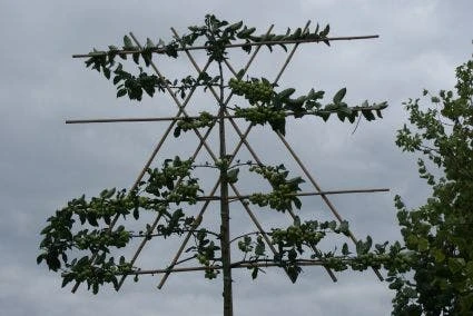 Malus ‘Red Sentinel’ (Sierappel) als leiboom gekweekt.