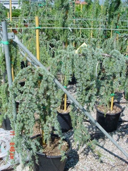Cedrus libani ‘Glauca Pendula’ is een blauwe Treurceder. Hier is de Ceder als plant op stam gekweekt.